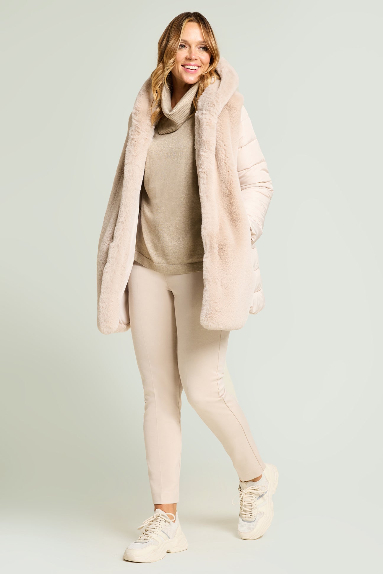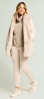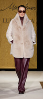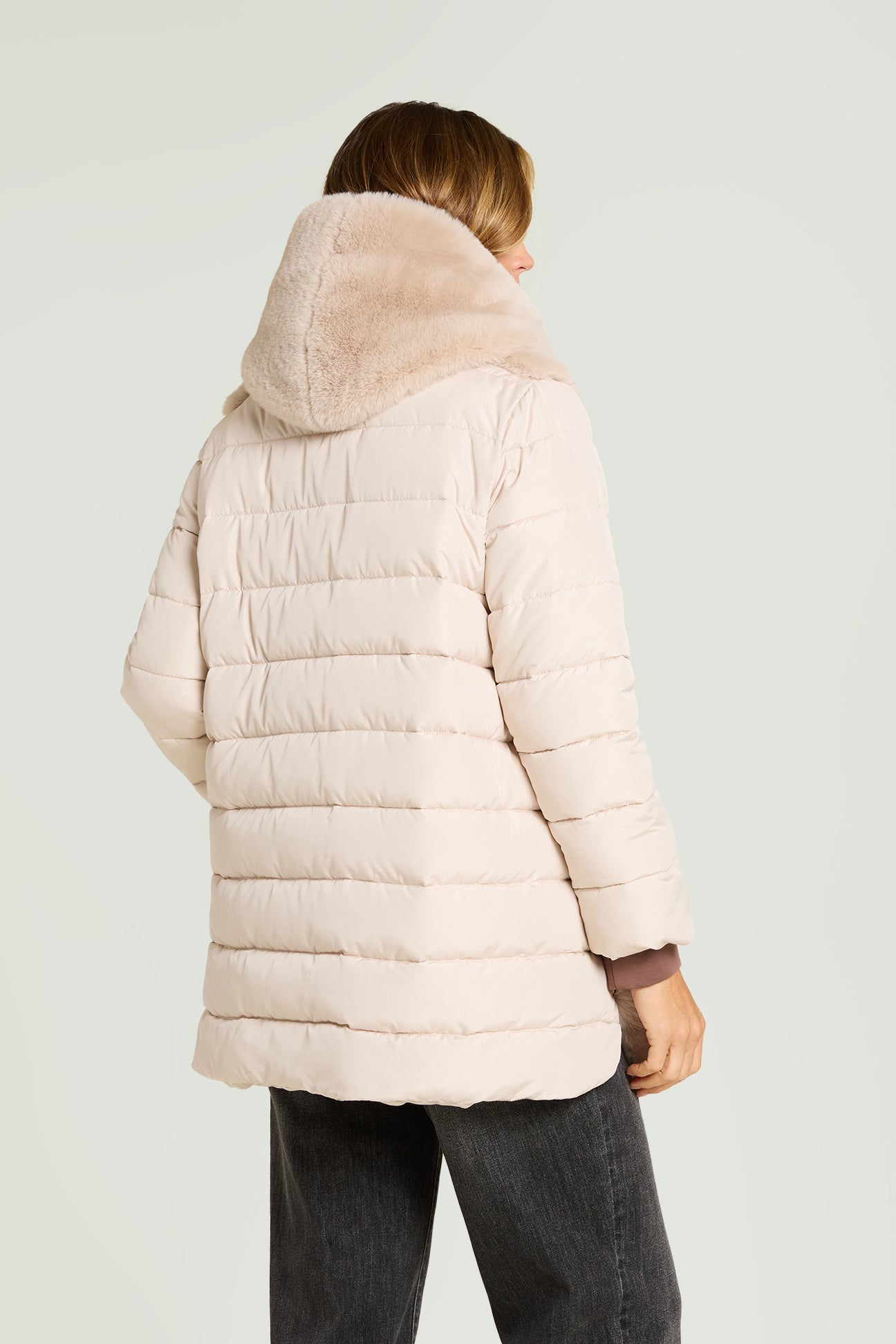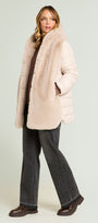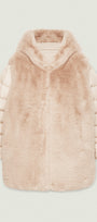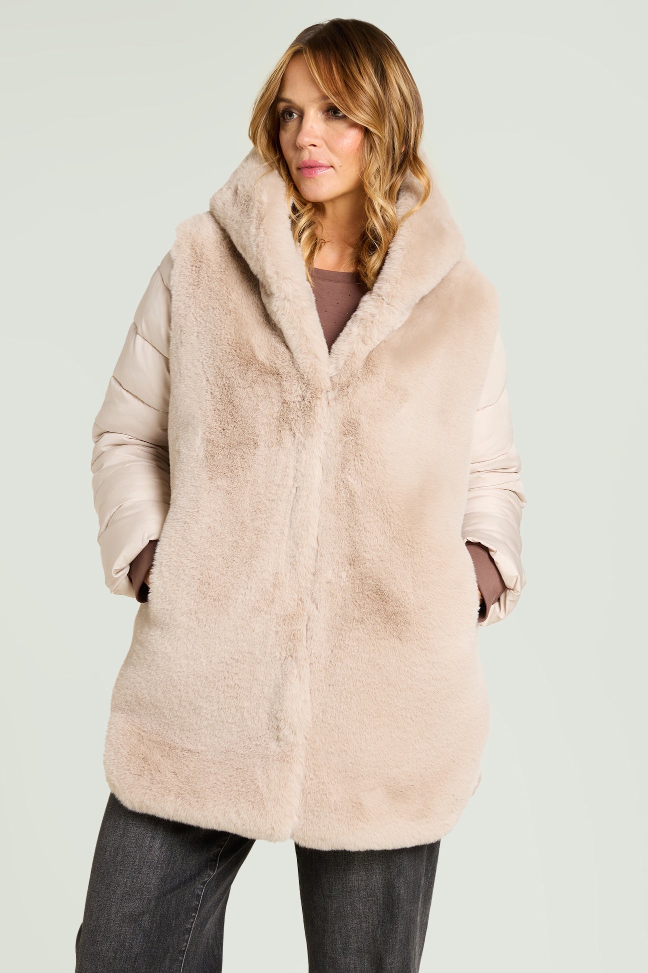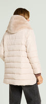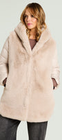 Piumino bimaterico dalla linea leggermente svasata: davanti e cappuccio in tessuto a pelo lungo, maniche e dietro in nylon trapuntato con imbottitura fake down. Chiusura con gancetti, tasche a fessura.