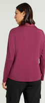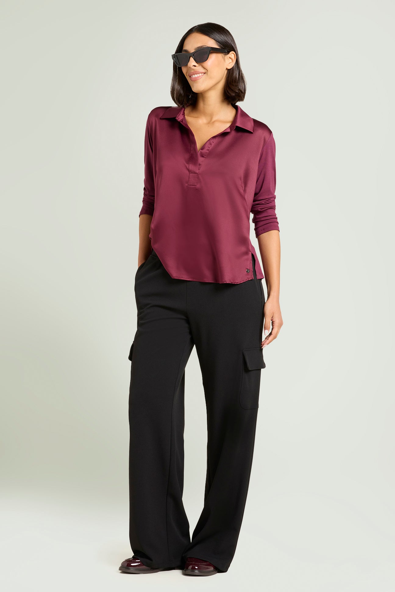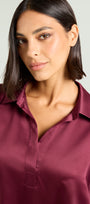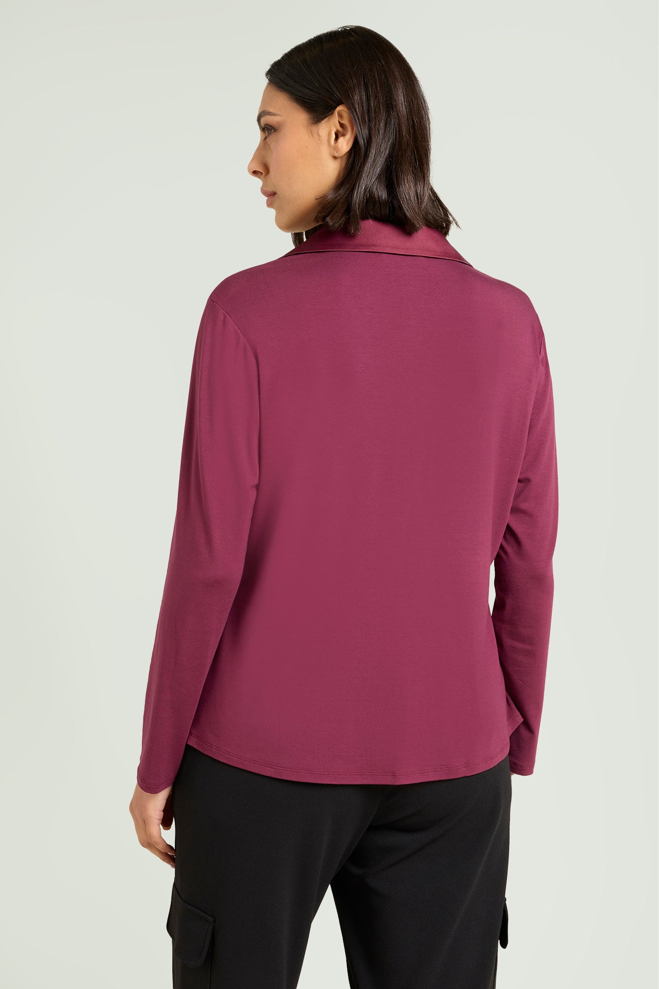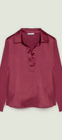 Camicia in jersey di viscosa stretch con davanti in raso. Linea leggermente affiancata con spacchetti laterali. Scollo ad "Y" con colletto polo. Manica lunga.