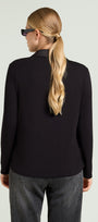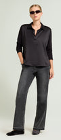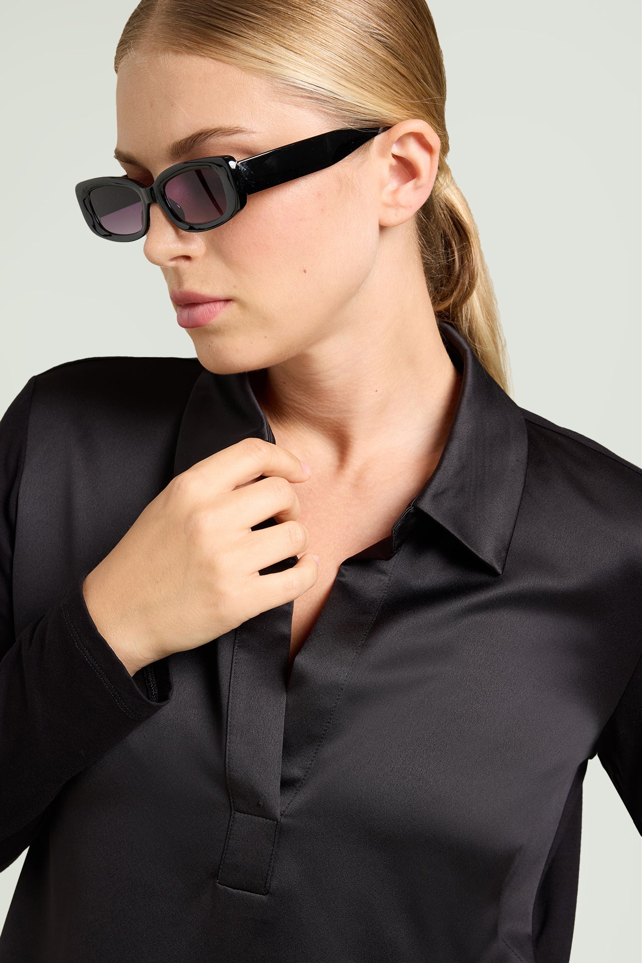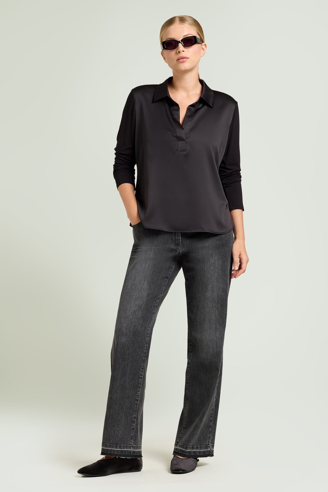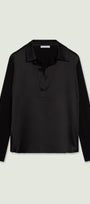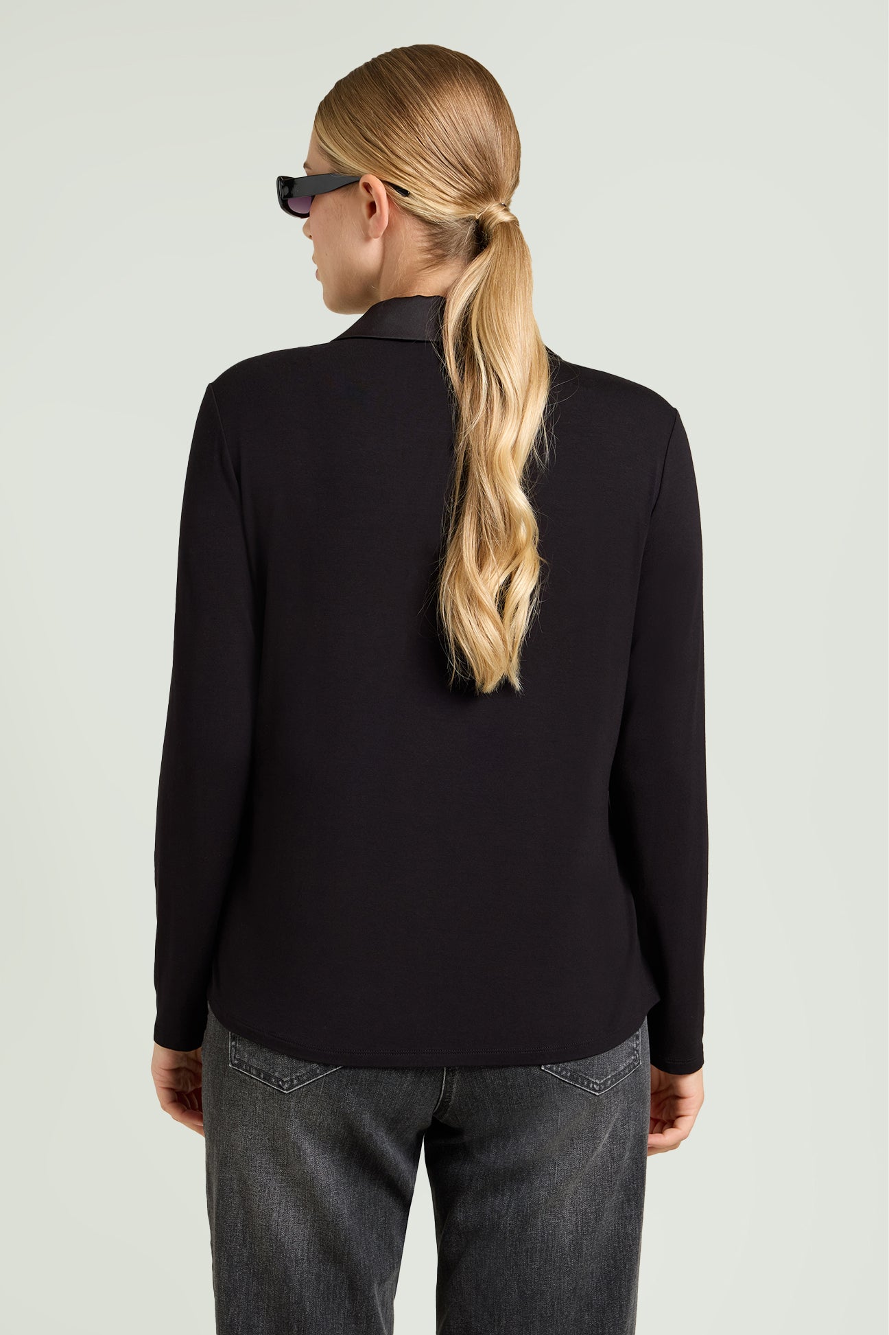 Camicia in jersey di viscosa stretch con davanti in raso. Linea leggermente affiancata con spacchetti laterali. Scollo ad "Y" con colletto polo. Manica lunga.