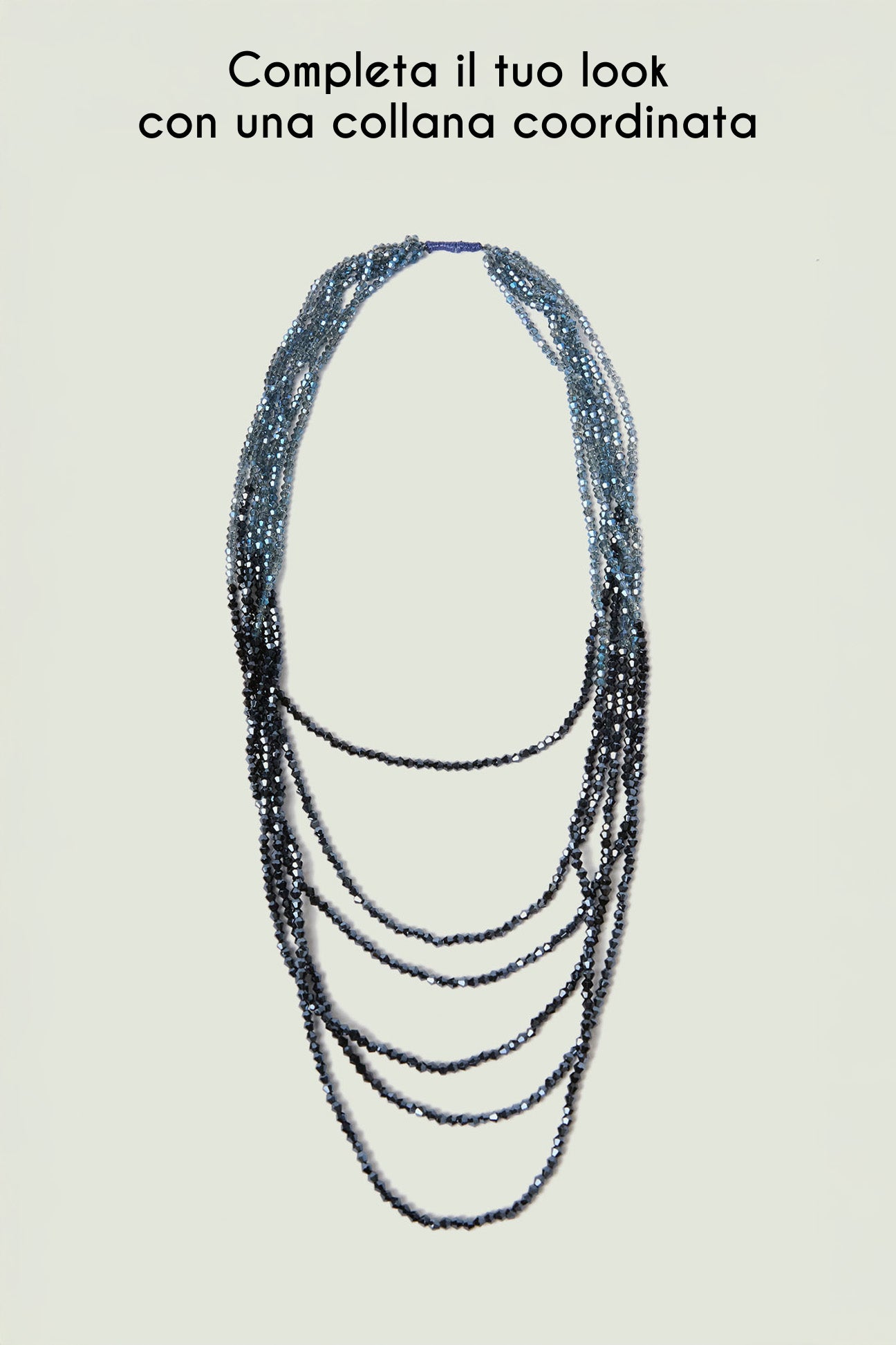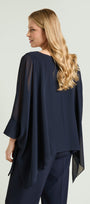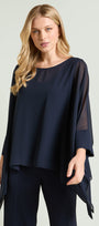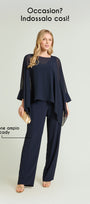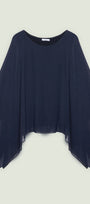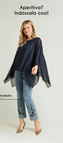 Capo formato da due pezzi: top in gersey elasticizzato con scollo a "V" e poncho in georgette, portabili anche separatamente. Scollo a barchetta, polso con bottone.