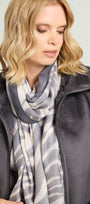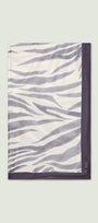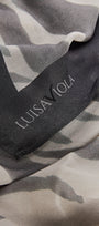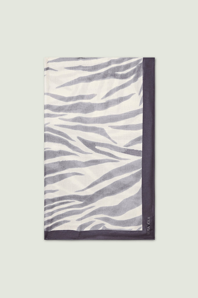 Sciarpa-foulard fantasia in twill di modal, cm.80 x 190. L'animalier -trend di stagione- viene reinterpretato in modo delicato e femminile con toni di grigio e di sabbia. Una stampa esclusiva Luisa Viola.