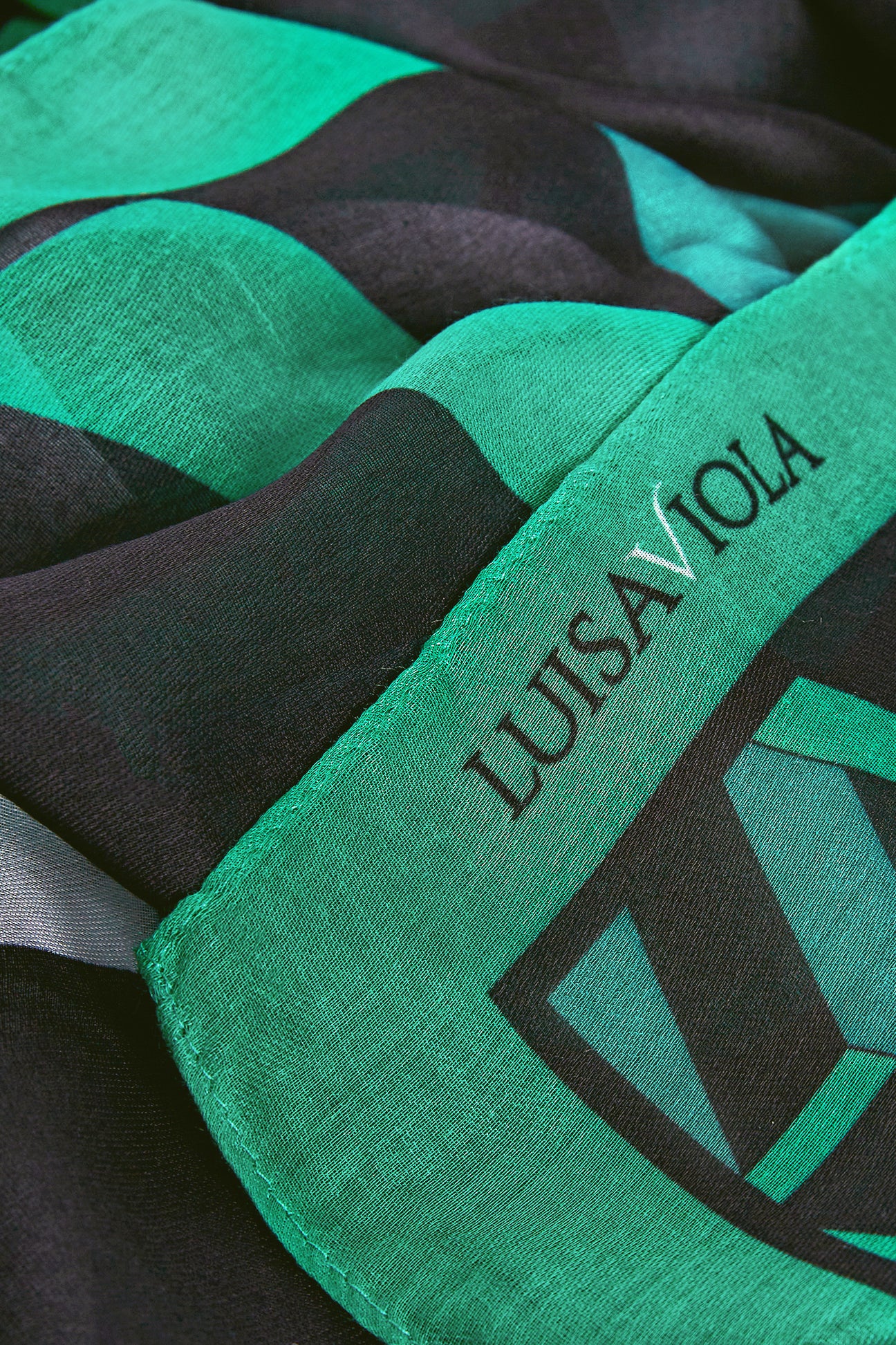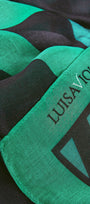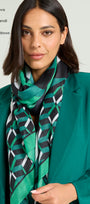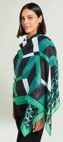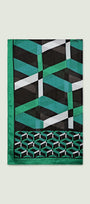 Sciarpa-foulard fantasia, tessuto garzato, cm.90 x 200. Un disegno geometrico con effetto 3D dove il nero del fondo è illuminato da tocchi di verde smeraldo e bianco.