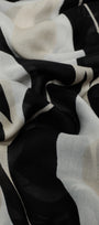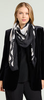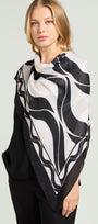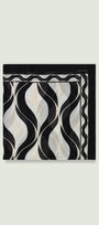 Sciarpa-foulard stampata in twill di modal, cm.120x120. Una stampa che si rifà ai movimenti di avanguardia degli anni 60 legati alle stampe psichedeliche, attraverso le quali veniva rappresentata appieno una certa ricerca di novità visiva e concettuale, soprattutto nel contesto del jet-set della moda di alta classe internazionale. Stampe dove linee sinuose, onde, spirali e curve davano un sensazione di movimento, di cambiamento. In questa reinterpretazione il nero si sposa a tocchi di avorio e di naturale creando una sensazione elegante di grande carattere.