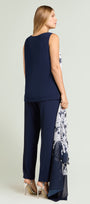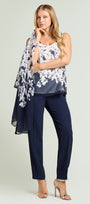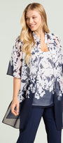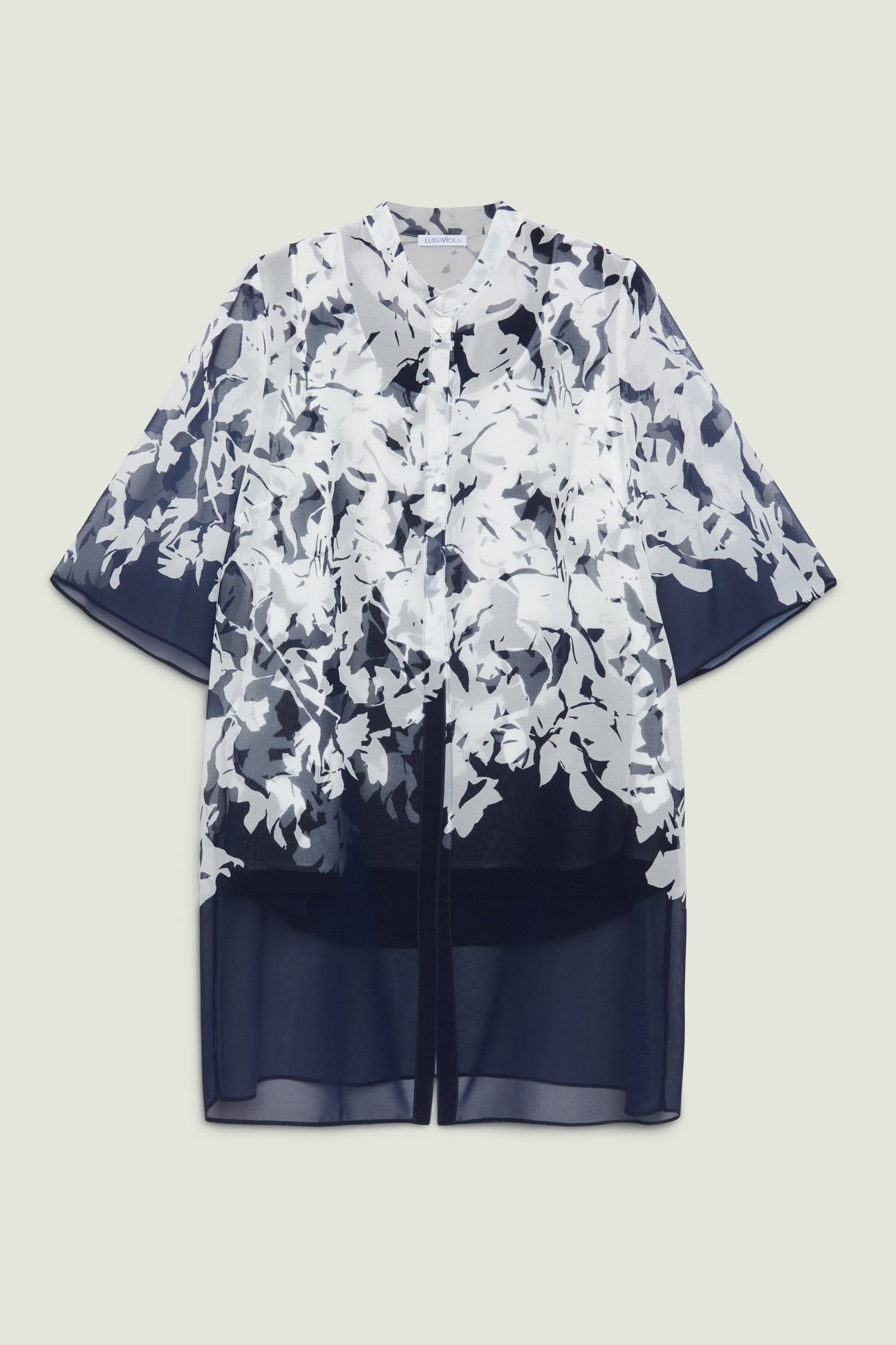 Completo in georgette stampata formata da spolverino e top. Spolverino dalla linea dritta con spacchi laterali. Collo a listino, chiusura con asole e bottoni, manica al gomito scampanata. Top con dietro in jersey fluido elasticizzato.