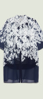 Silhouette di fiori e foglie emergono luminose sul fondo blu, creando un raffinato gioco di pieni e vuoti. Una stampa esclusiva Luisa Viola.