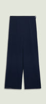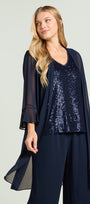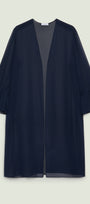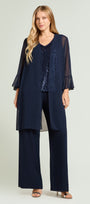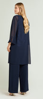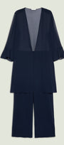 Completo formato da spolverino e pantalone nello stesso tessuto. Spolverino in georgette dalla linea dritta con alti spacchi laterali, manica con lunghezza a tre quarti e volant. Il pantalone è in georgette, foderato in jersey stretch: ha la linea a palazzo, con punto vita regolare, e la cintura estesibile con gros grain elastico inserito nel tratto dietro: un pantalone che associa eleganza e comfort, sposando la piacevolezza del jersey elasticizzato alla leggerezza della georgette.