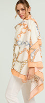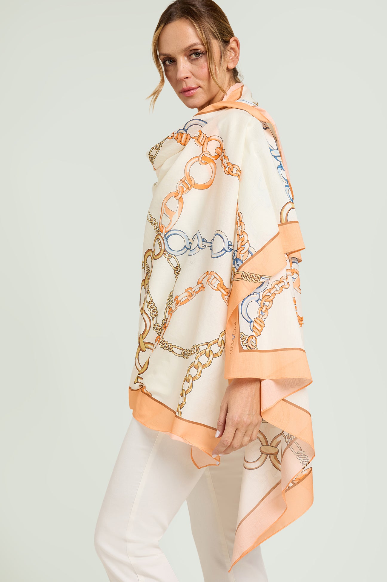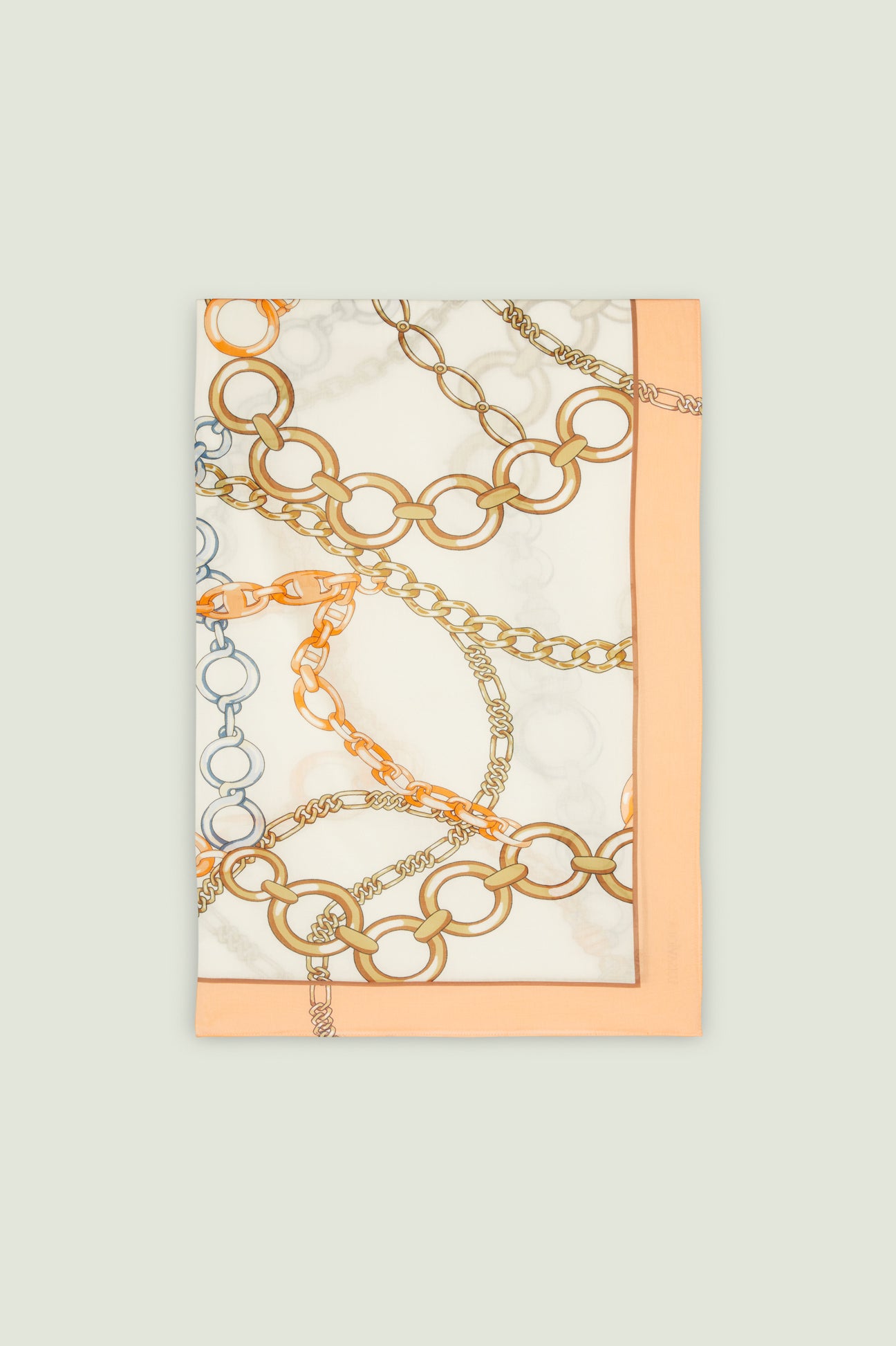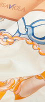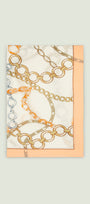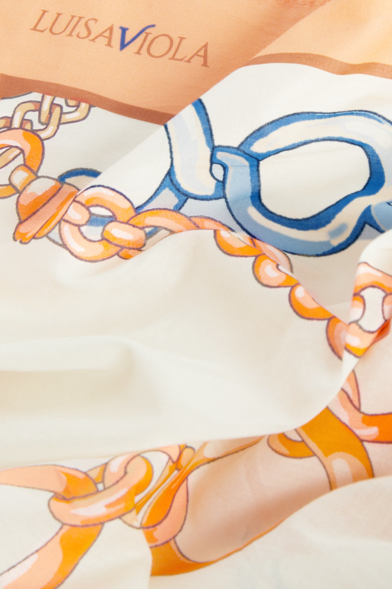 Un intreccio elegante di catene e anelli dorati scorre sul tessuto come un gioiello leggero. Il fondo chiaro valorizza il disegno, mentre le sfumature calde dell’oro si alternano a delicati accenti di colore, creando una stampa di carattere e senza tempo. Una stampa esclusiva Luisa Viola.