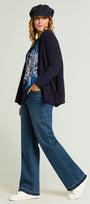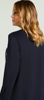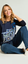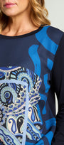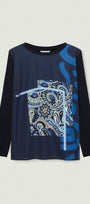 T-shirt in jersey di viscosa stretch con davanti in crepe de chine. Girocollo, manica lunga, fondo stondato. Stampa esclusiva Luisa Viola.
