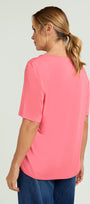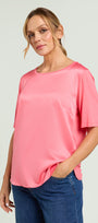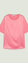 T-shirt in jersey di viscosa stretch con davanti in raso. Girocollo, manica corta, spacchetti laterali stondate.