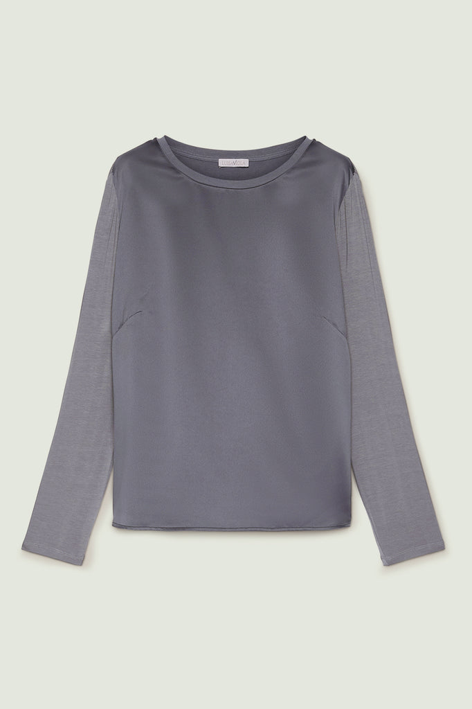 T-shirt in jersey di viscosa stretch con davanti in raso comfort. Girocollo, manica lunga, spacchi laterali. Medaglietta gunmetal con il logo "V" di Luisa Viola.