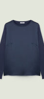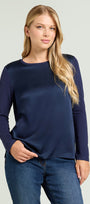 T-shirt in jersey di viscosa stretch con davanti in raso comfort. Girocollo, manica lunga, spacchi laterali. Medaglietta gunmetal con il logo "V" di Luisa Viola.