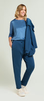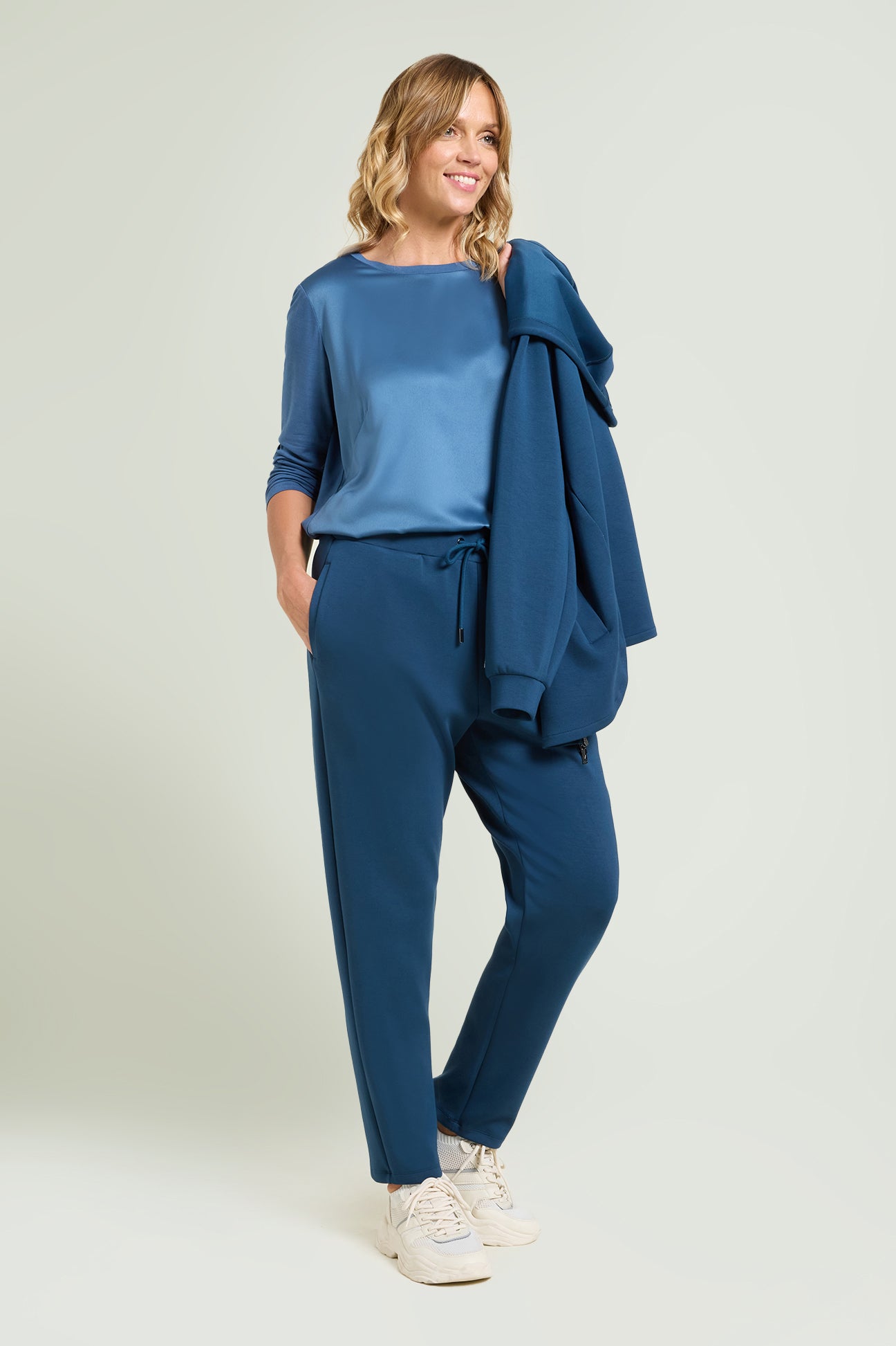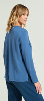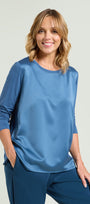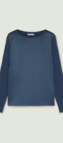T-shirt in jersey di viscosa stretch con davanti in raso comfort. Girocollo, manica lunga, spacchi laterali. Medaglietta gunmetal con il logo "V" di Luisa Viola.