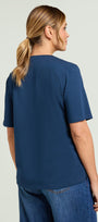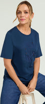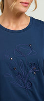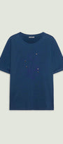 T-shirt in jersey di puro cotone con scollo rotondo e manica corta. Ricamo cornelly tono su tono con castoni in vetro applicati a mano. Un ricamo esclusivo Luisa Viola.