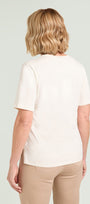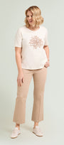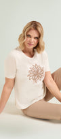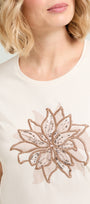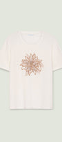 T-shirt in jersey di puro cotone con scollo rotondo, manica corta e spacchetti laterali, caratterizzata da un elaborato disegno con effetto 3D realizzato in tre passaggi: stampa, ricamo in filo ed applicazione paillettes.
