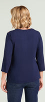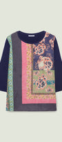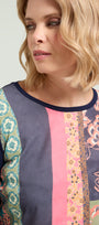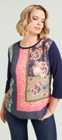 T-shirt in jersey di viscosa stretch con davanti in crepe de chine stampato. Scollo rotondo, manica con lunghezza a tre quarti, spacchetti laterali.