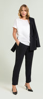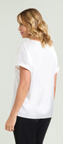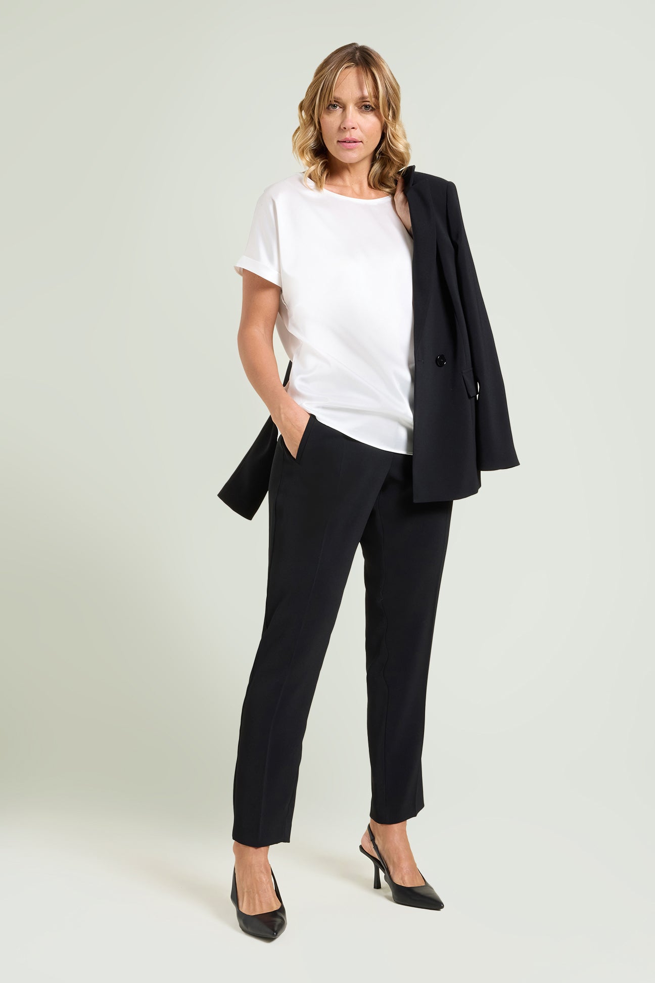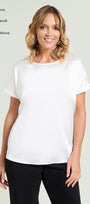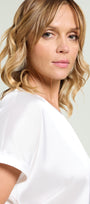 Top passepartout in satin stretch. Linea dritta, scollo a barchetta, taglio chimono, manica corta corta con risvolto.